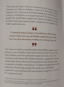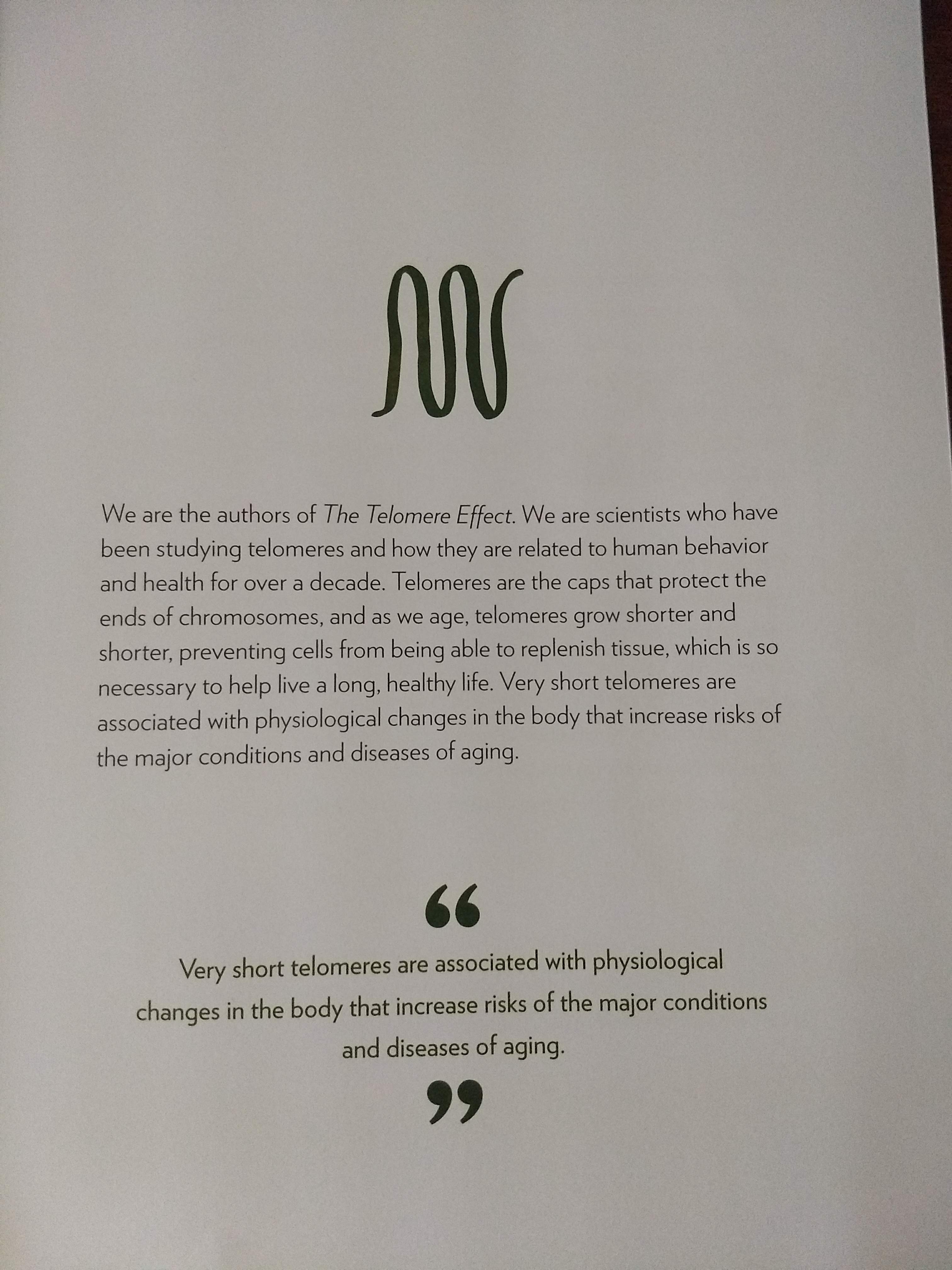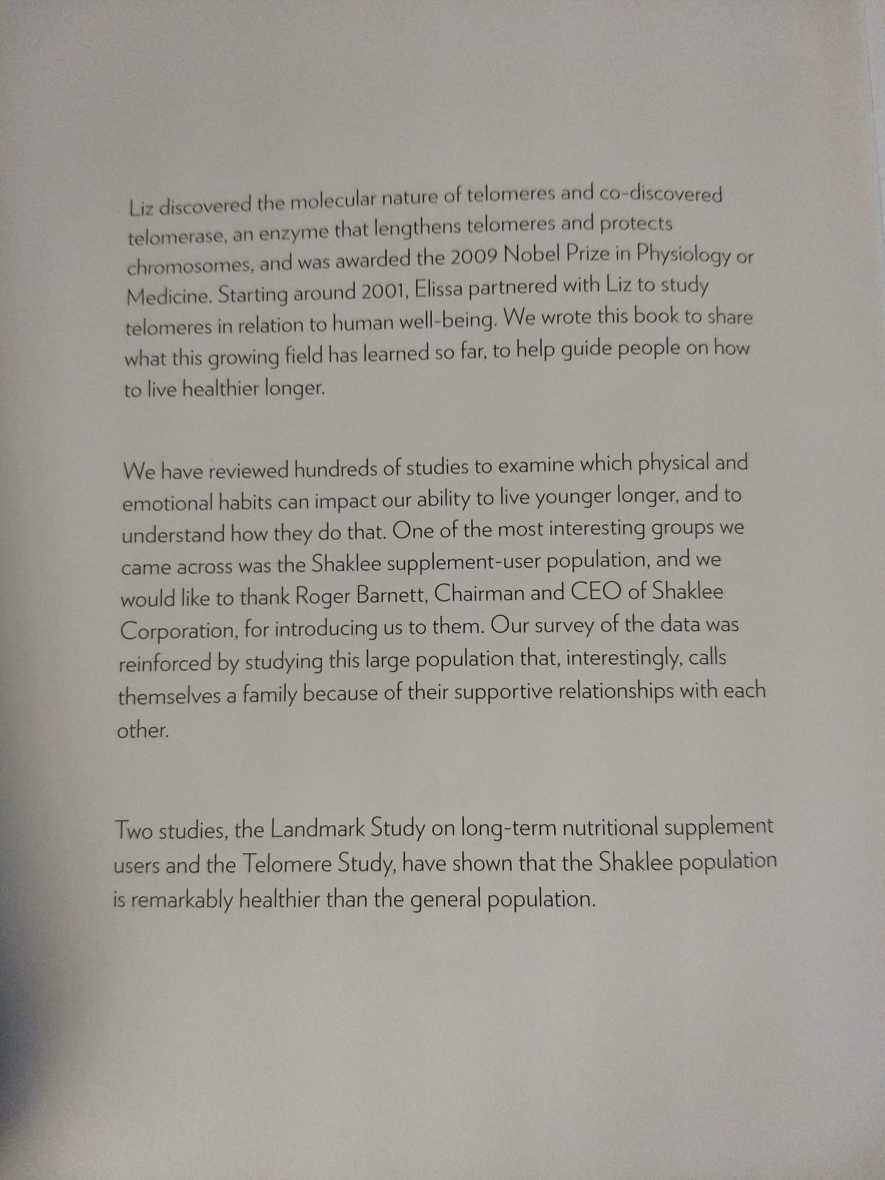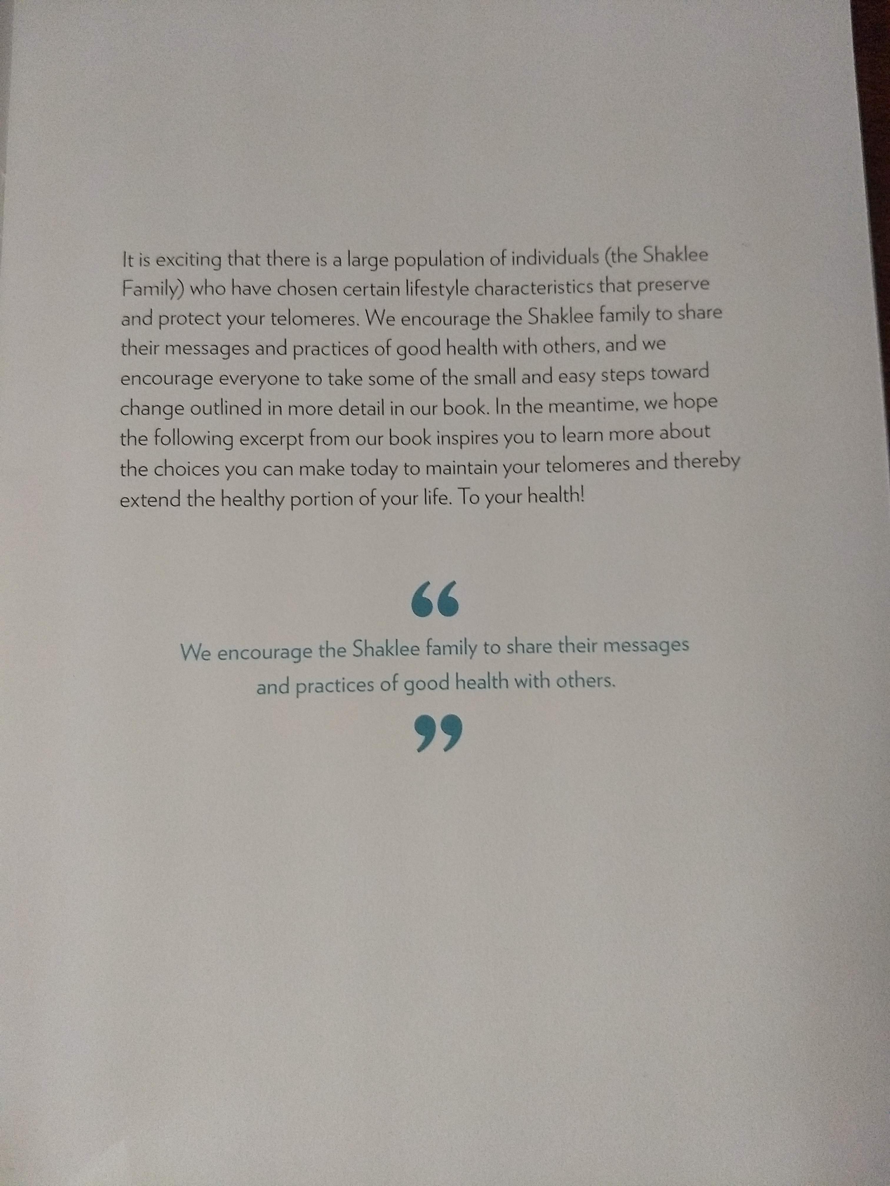 I haven’t posted anything in a while. But today, as it hit me that I’m way overdue, the topic that was on my mind was telomeres. If you have heard of them, you are ahead of me. I’d never heard of them before finding out about the Shaklee Telomere Study and I believe I found out about that in 2015. Essentially, telomeres are the protective caps on the ends of our chromosomes. When we are young, they are relatively long caps. As we age or our health declines, they are much shorter and they cannot protect our DNA as well. In 2017, at the Shaklee Global Conference, I was fortunate to hear Elizabeth Blackburn, PhD speak about these protectors of our DNA. She is the Nobel Prize winner that discovered telomerase and studied telomeres’ involvement with the aging process. At that time, I got the book that she co-authored- A Revolutionary Approach to Living Younger, Healthier, Longer: The Telomere Effect. The book is fascinating. It goes into detail about how lifestyle and nutrition choices can impact our telomeres and consequently, our health. At the conference, Elizabeth Blackburn spoke to us about the positive and impressive findings regarding telomere length for people using Shaklee supplements together with Vivix. What she shared about the findings was exciting. However, the topic in her book that impresses me as one of the best things that any person, regardless of access to Shaklee supplements can do to positively impact their telomere length, is: sufficient and good SLEEP. Probably because this is one area that I have struggled with from birth, it truly is something that I am convinced needs to be talked about. These are the restorative benefits of good, consistent, sleep: it sets your biological clock, regulates your appetite, and helps process and heal memories, while rejuvenating your mood. (p.190 The Telomere Effect). Your biological clock is responsible for keeping up with cellular repairs. It is when damaged cells are disposed of and repairs to the DNA are made. (ibid). Keeping your environment light when you are awake and dim or dark as you transition to sleep at regular times helps keep your biological clock in sync. Additionally, deep, REM sleep (Rapid Eye Movement sleep accompanied by dreams, higher heart rate, and faster breathing), is very important in keeping your appetite under control. During this important stage of sleep, cortisol production is suppressed and metabolic rate is increased. Therefore, if you get less REM sleep during the second part of the night, you will have higher levels of cortisol and insulin. This will stimulate appetite and can lead to insulin resistance. As The Telomere Effect explains, “a bad night of sleep can throw you into a temporary prediabetic state,” and bring on more feelings of hunger the following day. (p. 191) Now, what about memories and mood? When deprived of sleep, we do not focus as well and consequently our memories are not as good at taking in new information. If fact, sleep helps create “new connections between brain cells.” (ibid) Alternately, restorative sleep encourages memories that are hurtful, to heal as well as helping reduce their negative emotional charge. (ibid). Matt Walker, a sleep researcher at UC Berkley, found that this happens largely during REM sleep when some of the stimulating chemicals are turned off, allowing for the content of the negative memory to be split from the emotions. Over time, this will allow someone to think of a painful experience without experiencing the accompanying harsh jolt to mind and body. (p. 192 The Telomere Effect). Additionally, restorative sleep helps us restore emotionally. I’m sure most of you can relate that when you are lacking in sleep, your irritability increases. In fact, all emotions are more intense when your body is deprived of sleep. (ibid). So, you might ask, how many hours of sleep do our telomeres need? Well, there are a very small percentage that don’t need as much and another small percentage who need more, but the rule of thumb that the studies indicate is: Get at least 7 hours of sleep every night or your telomeres will suffer and end up shorter. To tell if you just might fall into one of those categories that needs more or less than 7 hours, the way to tell if you are getting sufficient restorative sleep is to ask yourself: “Do I feel sleepy during the day?” If the answer is, “Yes!” then you need more sleep at night. (p. 192-193 The Telomere Effect). That being said, it isn’t just the hours- quality, regular, sleep according to the natural rhythm of day and night is equally important for telomere length. (p. 193 The Telomere Effect). So, Sleep. It does the body good. The pictures below show the cover of Elizabeth Blackburn’s book which I shared a little from, here in this post…. as well as the special forward that she shared with the Shaklee family at the 2017 Global Conference.