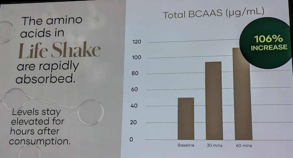 Keep in mind, Shaklee has never stopped. They are constantly trying to improve. The general session today reminded me that they have put $500 million dollars into research and development. So, today marks the day that Shaklee has just made available an improved, even more powerful and health building plant protein Life Shake. What are the key improvements? What has Shaklee done to stive to do even better with their foundational protein product? And, yes, Life Shake already combined 1/3 recommended daily value for 25 key nutrients (Shaklee Quality) with 20 grams of clean protein (Shaklee Quality) as well as fiber (prebiotic to support gut health) and dietary enzymes. So what has been improved? Instead of five grams of sugar, Shaklee Plant Life Shake now has zero grams. In addition, the improved Life Shake now has zero seed oils and now has higher amounts of key nutrients to support bone health: Vitamin D, K, and Calcium and B12 to support energy. It has also been proven to be non-inflammatory and is still low glycemic and still has 2.5 grams of Luceine, a key amino acid in supporting lean muscle mass. Protein cannot be stored by the body, but in clinical studies, Shaklee’s Life Shake was shown to elevate total branch chain Amino Acids in the blood as soon as 30 minutes after having Life Shake and even greater amounts at one hour after, and still showed elevated amounts at 2 hours after consuming one Life Shake.